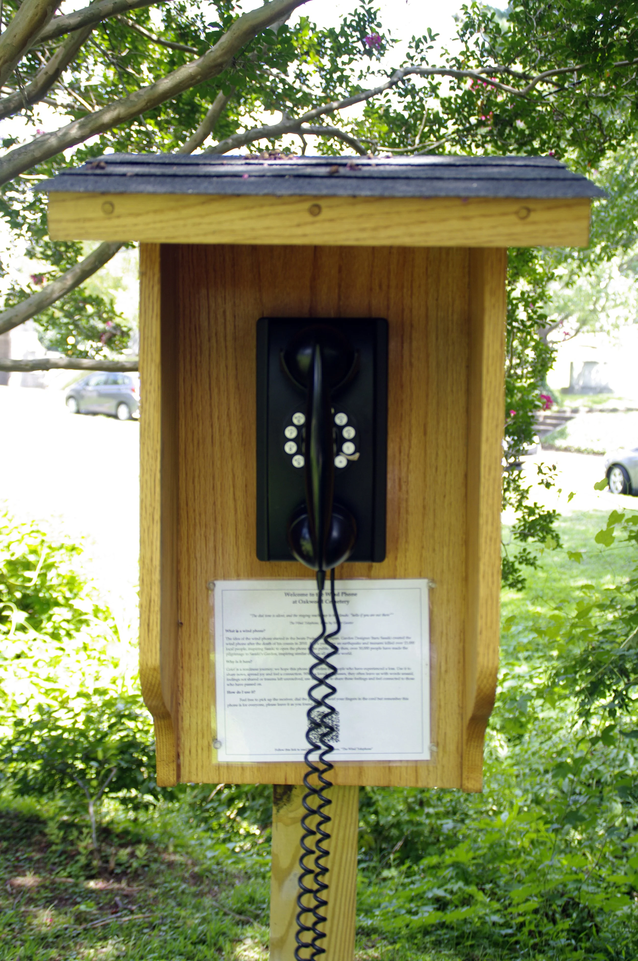 This wind telephone is located in Raleigh’s beautiful Oakwood Cemetery which opened in 1869. After entering the cemetery, continue straight, cross the bridge to the right, and park near the office in the parallel parking spots there (you can see our black Volvo parked in the background). Cross over the bridge again on foot and turn to the right. Almost immediately, there is a set of marble pavers on the right that will lead you to the wind telephone.